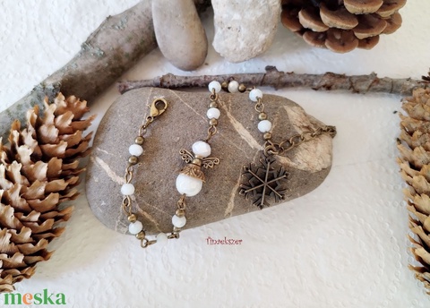 Angyal karkötő #1 - fehér üveggyöngy, bronz hópehely