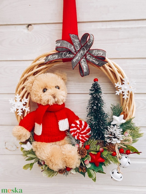 - Anyaga: fonott koszorú alap, plüss maci, termések, selyem szalag