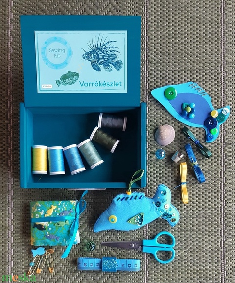 "Tengeri parádé" halacskás varrókészlet, kék-zöld-sárga varródoboz, halas szett fadobozban
