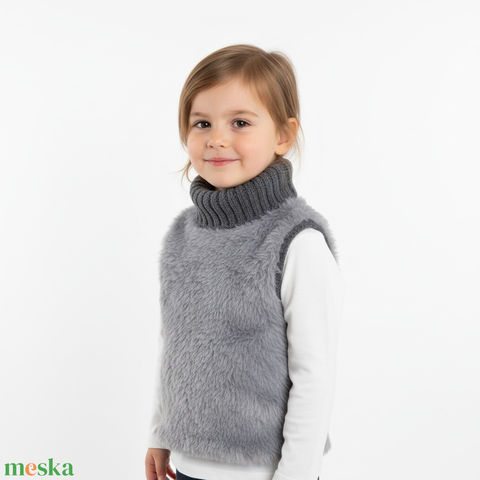 100 % 3féle szürke színű akril és szempillafonalból kötöttem a poncsót, 39 cm hosszú a garbó nélkül, 27 cm széles. A poncsó nyúlik, de kb. ilyen méretű kislányra való.