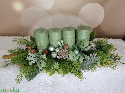 - Anyaga: tálca, gyertya, műfenyő ágak