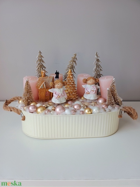 Angyalkás mézeskalács kerámia díszes rózsaszín gyertyás adventi karácsonyi ünnepi asztaldísz