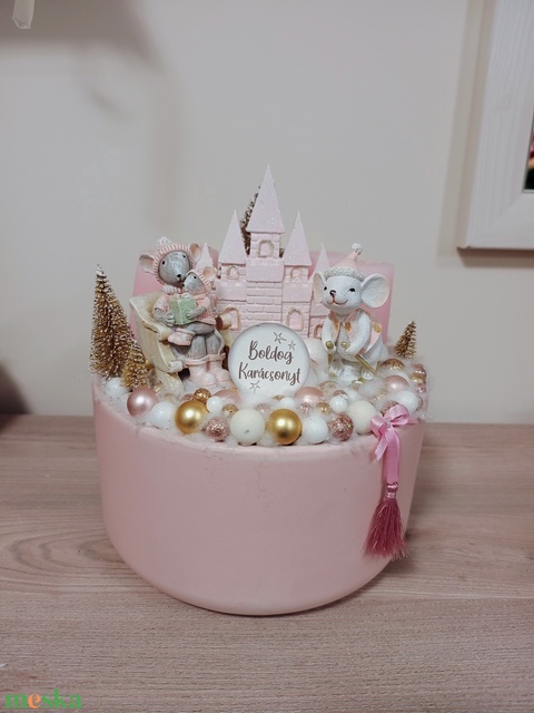 Púder rózsaszín egér figurás kastély díszítéssel négy gyertyával adventi karácsonyi ünnepi asztaldísz