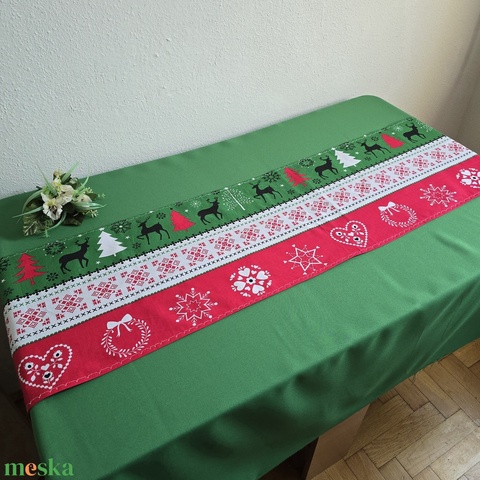Fenyőfa, rénszarvas mintás karácsonyi asztalközép, asztali futó, terítő