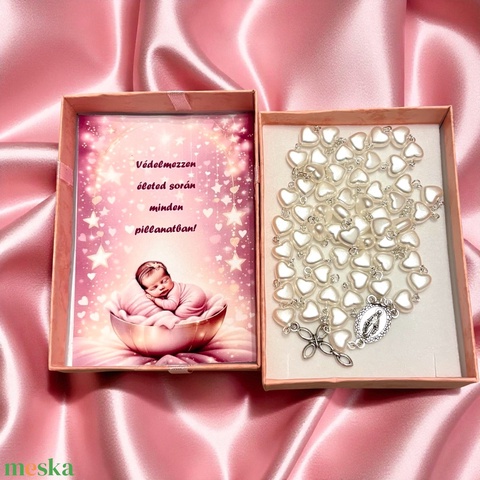 Keresztelő ajándék öttizedes rózsafüzér díszdobozban kísérő szöveggel lány gyermeknek