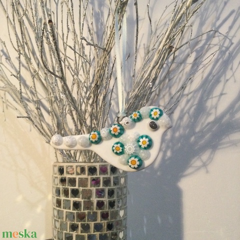 Üvegdísz - muránói madárka- sárga, zöld és fehér