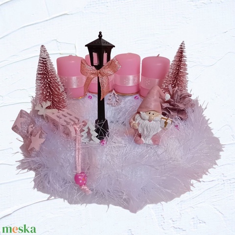Adventi, karácsonyi manós koszorú, asztaldísz rózsaszín