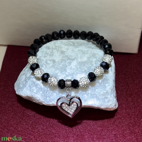 Fekete üvegkristály gyöngykarkötő szív charm medállal 16 cm