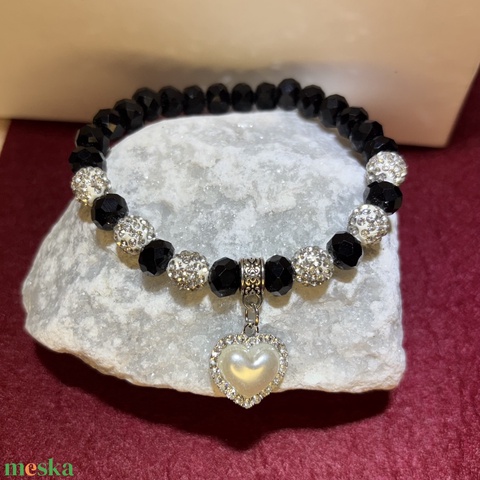 Fekete üvegkristály gyöngykarkötő szív charm medállal 16 cm-es