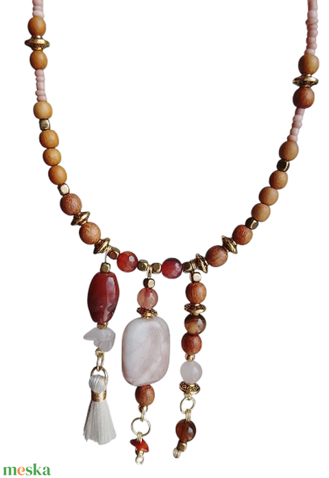 Fagyöngy, achát, jáspis, kvarc és üveggyöngyös nyaklánc