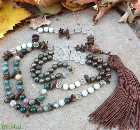 - Anyaga: zsinór, ásványok, kristályok, pirit, achát, hegyikristály, amazonit