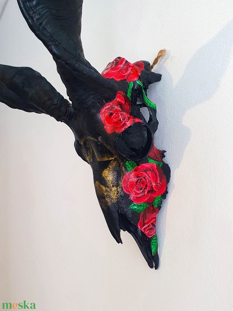 SavageSkullz magyar racka birka koponyára kézzel festett rózsával és arany pentagrammal