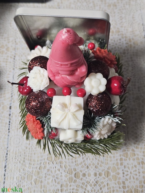 100%szójaviasz, illóolaj, fémdoboz, tűzőhab, karácsonyi gömb, micapor
