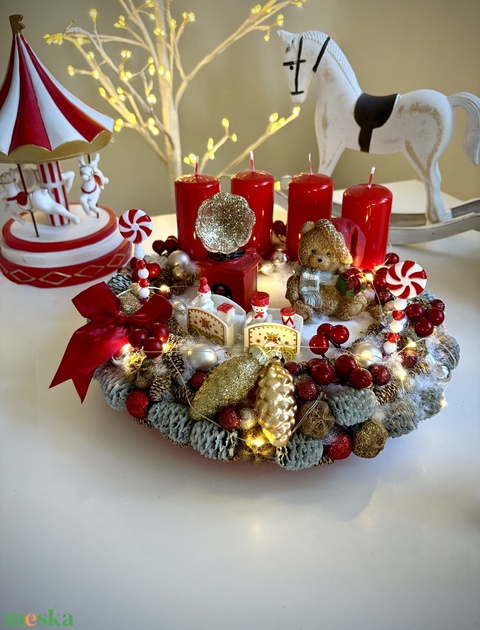 LED-es Világító, maci adventi koszorú, mackó adventi dísz