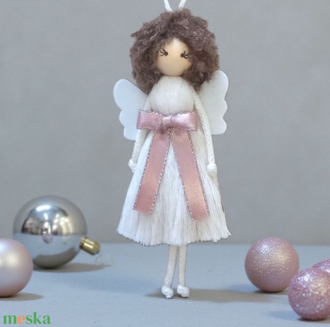 Makramé angyal karácsonyfadísz – kócos hajjal, elegáns masnival és filc szárnnyal