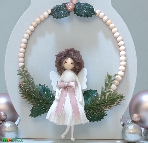 Karácsonyi ajtódísz / falidísz – kócos hajú, masnis makramé angyal fagyöngy karikán, csillogó zöld dekorral