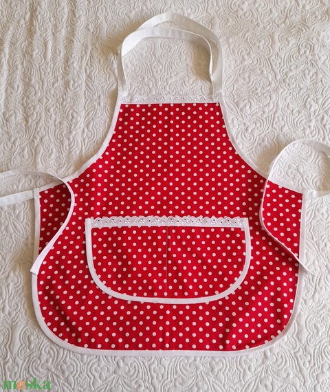 Pamut vászon pöttyös gyerek kötény madéra csipkével
