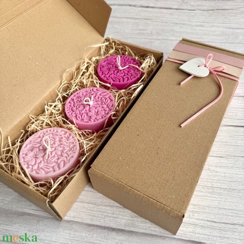 Kézműves szójaviasz gyertya válogatás (3 db) díszdobozban – Málna árnyalatok
