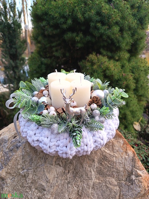 pamut zsinórfonal, szalma koszorúalap, gyertyák, élethű fenyőágak, tobozok, bogyók, ezüst szarvas, ezüst gömbök