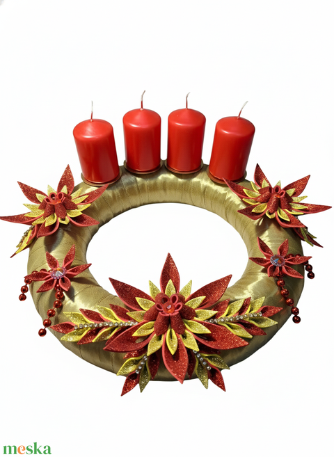 Adventi koszorú csillámos dekorgumi virágokkal, gyertyákkal.Arany-piros