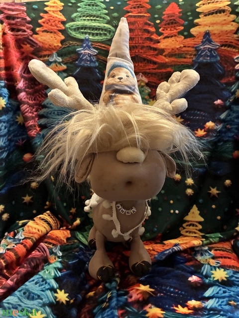 Drótvázas szarvaska, 40 cm magas. Az egész testében, azarvaiban, sapkában drót van, hajlítható.