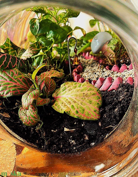 - Anyaga: fittónia, hálóslevél, moha, üveg, termőközeg, parafadugó, kézműves dekoráció