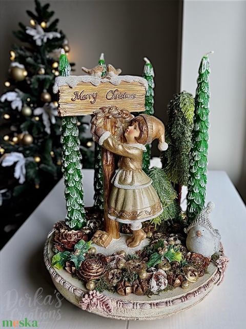 - Anyaga: fa tálca, kerámia figura, gyertya, szárított termések, egyéb díszítő elemek