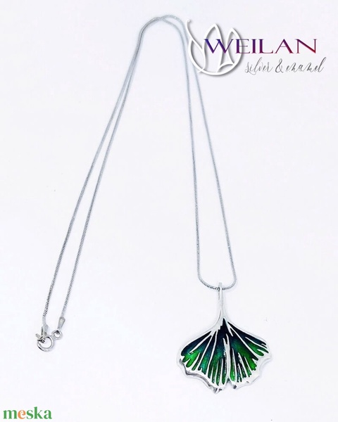 Leaf - Ginkgo Biloba - ezüst tűzzománc medál, ezüst láncon, smaragdzöld