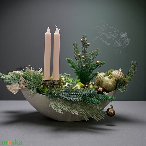 Adventi asztaldísz – Bézs–Gold csónak alakú tálban (4 bézs gyertyával)