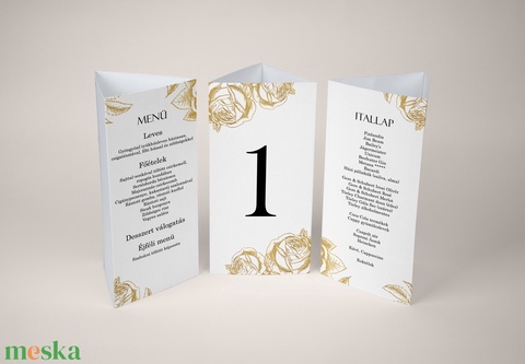 Esküvői menükártya asztalszámmal, arany színű rózsa mintával (digitális termék)