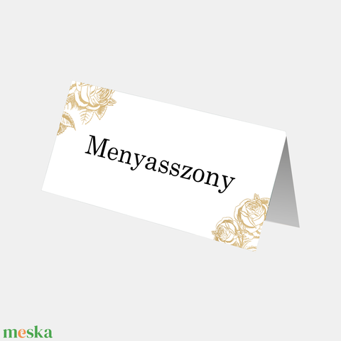 Névre szóló esküvői ültetőkártya arany színű rózsamintával.