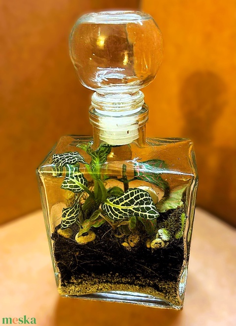 - Anyaga: fittónia, hálóslevél, moha, üveg, termőközeg, parafadugó, kézműves dekorávió