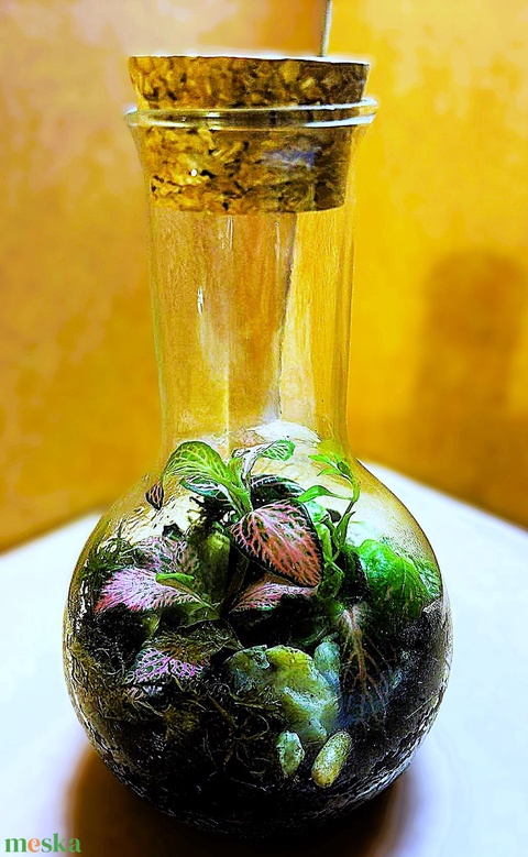 - Anyaga: fittónia, hálóslevél, moha, üveg, termőközeg, parafadugó