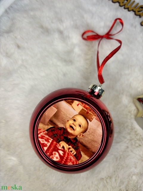 Gömb alakú, fényképes, piros karácsonyfa dísz