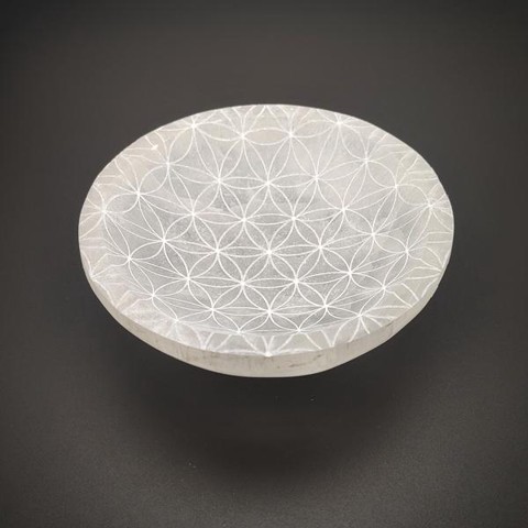 Szelenit talpas kerek tál gravírozott Életvirág mintával 10 cm