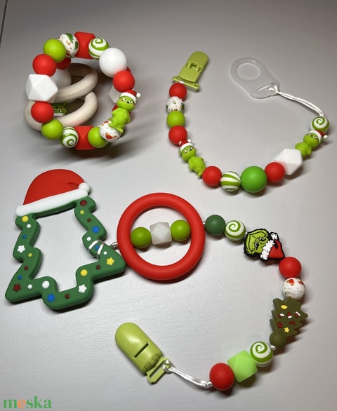 - Anyaga: szilikon gyöngy, szilikon rágcsa, selyem szalag