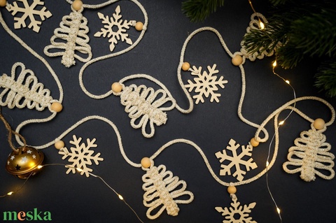Karácsonyi girland makramé fenyőfával és fa hópelyhekkel