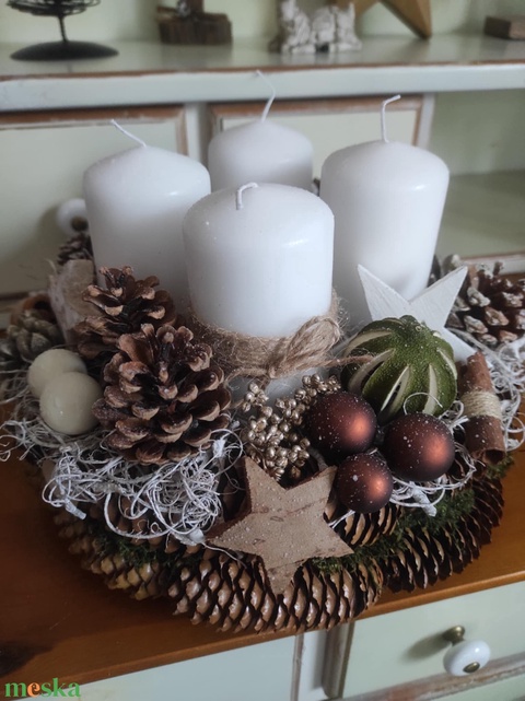 - Anyaga: szalma alap, toboz, termés, gyertya, üveggömb