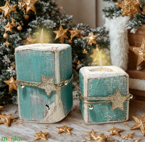 Rusztikus Fa Mécsestartó - 2 db. - Ajándék ötlet - Fehér, Arany, Türkiz
