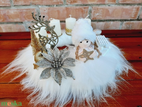 fa, selyemszalag, gyertya, fém gyertyatű, műszőrme