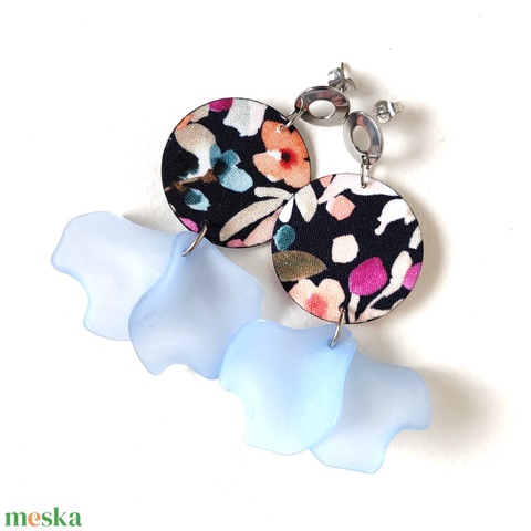 Sötétkék nagy virágmintás textilfülbevaló jégkék szirmokkal