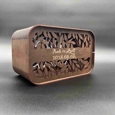 Pénzgyűjtő doboz esküvőre – egyedi névvel, rusztikus stílusban Ez az egyedi névvel gravírozott esküvői pénzgyűjtő doboz rusztikus fa megjelenésével és elegáns kivitelezésével stílusos kiegészítője a nagy napnak. Praktikus megoldás nászajándék pénz gyűjtésére, miközben maradandó emlék is marad. Tökéletes választás más esküvői kiegészítőink mellé, például a nászajándék gyűjtő . A nászládára szánt feliratot, a neveteket és a dátumot a Megjegyzés rovatban tüntessétek fel. A terméket natűr szíben gyártjuk, barnára pácolva feláras. Mérete: 23x16x11 cm Esküvői pénzgyűjtő doboz – rusztikus stílus, egyedi névvel gravírozva Ez a rusztikus stílusú esküvői pénzgyűjtő doboz egyedileg gravírozott névvel készül, így igazán személyes és maradandó része lehet a nagy napnak. A természetes faanyag és a finom lézervágott minta elegáns, vintage hangulatot idéz, amely tökéletesen illeszkedik bármilyen dekorációhoz – különösen egy szabadtéri, boho vagy vidéki esküvőhöz. A doboz tetején lévő nyíláson keresztül könnyedén behelyezhetőek a borítékok, pénzajándékok, jókívánságok vagy akár sorsjegyek is. Az egyedi gravírozásnak köszönhetően a doboz nemcsak praktikus, de örök emlék is a páros számára. Miért válaszd ezt a pénzgyűjtő dobozt? Személyre szabható a menyasszony és vőlegény nevével Rusztikus, természetes fa dizájn, ami különleges hangulatot teremt Tökéletes kiegészítő a sorsjegy gyűjtő dobozhoz vagy köszönetajándékokhoz Magyar kézműves termék, minőségi kidolgozással Válaszd ezt a pénzgyűjtő dobozt, ha szeretnél egy stílusos és személyes megoldást a nászajándék pénz gyűjtésére. További inspirációért nézd meg a teljes esküvői dekoráció kínálatunkat.
