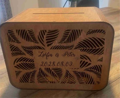 Nászajándék gyűjtő doboz / Esküvői pénzgyűjtő láda Ez a stílusos nászajándék gyűjtő doboz elegáns és praktikus megoldást kínál arra, hogy az esküvői vendégek kulturáltan, rendezett módon helyezhessék el pénzbeli ajándékaikat. Természetes natúr fa alapanyaga rusztikus, mégis modern hangulatot teremt, így bármilyen esküvői dekorációhoz harmonikusan illeszkedik. A tetején kialakított dobónyílásnak köszönhetően kényelmesen behelyezhetők a borítékok és készpénzes ajándékok, a nagy nap után pedig a doboz könnyedén átalakulhat személyes emléktárggyá. A pénzgyűjtő doboz kérhető egyedi gravírozással, így a pár neve, az esküvő dátuma vagy egy rövid idézet is rákerülhet. A gravírozás tartós, elegáns és időtálló, ezért a doboz nem csupán esküvői kellék, hanem olyan maradandó dísztárgy, amely később otthonotok egyik meghatározó dekorációja lehet. A terméket natűr szíben gyártjuk, barnára pácolva feláras. Mérete: 23x16x11 cm Természetes, esztétikus megjelenés A doboz natúr fa felülete meleg, letisztult hatást kelt, és tökéletes alapot biztosít a precíz gravírozáshoz. Strapabíró kialakítása gondoskodik róla, hogy biztonságban tartsa a vendégek ajándékait. Egyedivé tehető gravírozással A gravírozható felületre név, dátum vagy személyes üzenet is kérhető, így a doboz valóban egyedivé válik. A gravírozott rész különleges, dekoratív megjelenést kölcsönöz, amely hosszú évek múltán is megőrzi szépségét. Praktikus használat Tökéletes pénz- és borítékgyűjtéshez az esküvőn Stabil, könnyen kezelhető szerkezet A nagy nap után emléktárgyként vagy dekorációként tovább használható Műszaki adatok A doboz mérete ideális mennyiségű ajándék befogadására, miközben esztétikusan illeszkedik az ajándékasztalra. A nyílás mérete kényelmes és praktikus, a doboz stabilan áll. Miért ajánljuk? Természetes fa anyag és kézműves minőség Elegáns, letisztult design Egyedi gravírozás lehetősége Tartós és dekoratív emléktárgy a nagy nap után Funkcionális és esztétikus egyben
