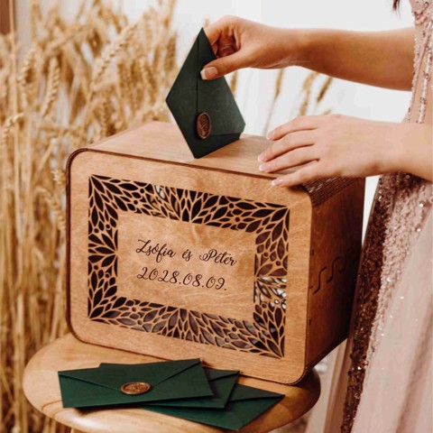 Nászajándék gyűjtő doboz / Esküvői pénzgyűjtő láda Ez a stílusos nászajándék gyűjtő doboz elegáns és praktikus megoldást kínál arra, hogy az esküvői vendégek kulturáltan, rendezett módon helyezhessék el pénzbeli ajándékaikat. Természetes natúr fa alapanyaga rusztikus, mégis modern hangulatot teremt, így bármilyen esküvői dekorációhoz harmonikusan illeszkedik. A tetején kialakított dobónyílásnak köszönhetően kényelmesen behelyezhetők a borítékok és készpénzes ajándékok, a nagy nap után pedig a doboz könnyedén átalakulhat személyes emléktárggyá. A pénzgyűjtő doboz kérhető egyedi gravírozással, így a pár neve, az esküvő dátuma vagy egy rövid idézet is rákerülhet. A gravírozás tartós, elegáns és időtálló, ezért a doboz nem csupán esküvői kellék, hanem olyan maradandó dísztárgy, amely később otthonotok egyik meghatározó dekorációja lehet. A terméket natűr szíben gyártjuk, barnára pácolva feláras. Mérete: 23x16x11 cm Természetes, esztétikus megjelenés A doboz natúr fa felülete meleg, letisztult hatást kelt, és tökéletes alapot biztosít a precíz gravírozáshoz. Strapabíró kialakítása gondoskodik róla, hogy biztonságban tartsa a vendégek ajándékait. Egyedivé tehető gravírozással A gravírozható felületre név, dátum vagy személyes üzenet is kérhető, így a doboz valóban egyedivé válik. A gravírozott rész különleges, dekoratív megjelenést kölcsönöz, amely hosszú évek múltán is megőrzi szépségét. Praktikus használat Tökéletes pénz- és borítékgyűjtéshez az esküvőn Stabil, könnyen kezelhető szerkezet A nagy nap után emléktárgyként vagy dekorációként tovább használható Műszaki adatok A doboz mérete ideális mennyiségű ajándék befogadására, miközben esztétikusan illeszkedik az ajándékasztalra. A nyílás mérete kényelmes és praktikus, a doboz stabilan áll. Miért ajánljuk? Természetes fa anyag és kézműves minőség Elegáns, letisztult design Egyedi gravírozás lehetősége Tartós és dekoratív emléktárgy a nagy nap után Funkcionális és esztétikus egyben