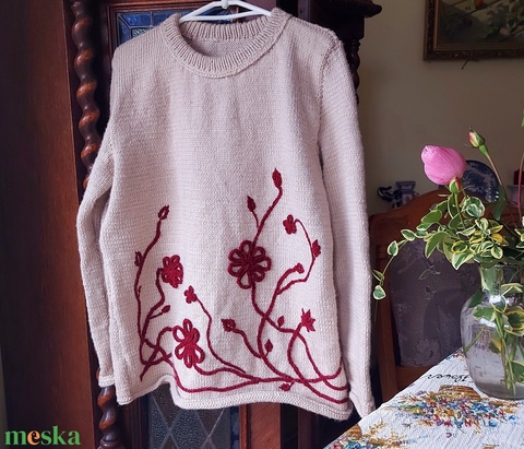 Kézzel kötött alpaka pulóver kézi hímzéssel. Nagy méretek L-XL