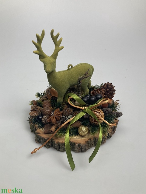 Fakorongra épült minidísz flokkolt, zöld szarvasfigurával, termésekkel s kellékekkel gazdagon díszítve (FX-19)