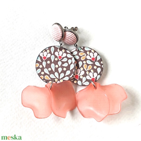 Szürke, rózsaszín virágmintás textilfülbevaló barackszínű szirmokkal