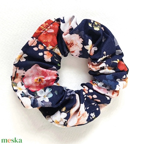 Sötétkék nagy virágmintás scrunchie, hajgumi