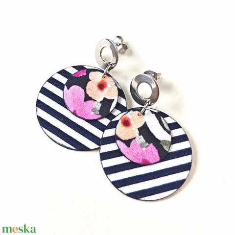 Sötétkék-fehér, virágmintás kisméretű textilfülbevaló