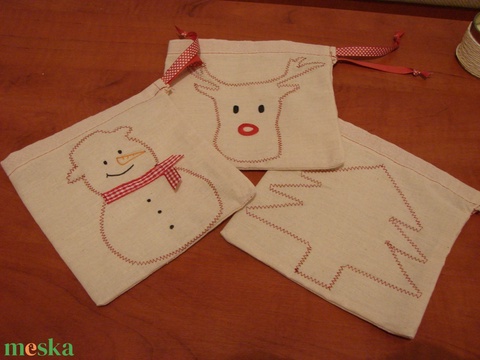 Meglepően sok minden fér ezekbe a kis zsákokba, és méretük miatt az apró gyerekcsizmákban is elrejtheti a Mikulás. A zsák belefűzött szalaggal összehúzható. A rénszarvas szeme, orra és a hóember szeme, orra, gombjai rajzolva. Készleten: 1-1 db.